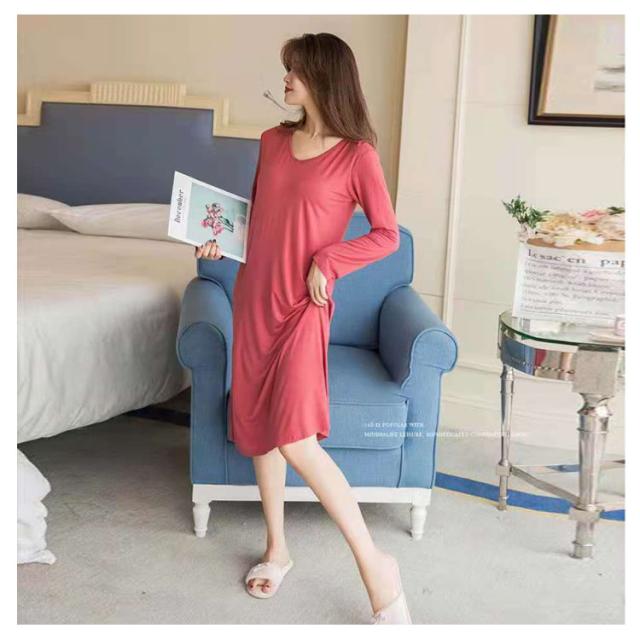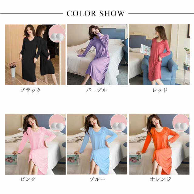 体型カバー ロング 夏 部屋着 ワンピース パジャマ ルームウェア 長袖 大きいサイズ 無地 ワンピースパジャマ おうち シンプル インナー ストレッチ マタニティ ナイトウエア 膝下丈 Uネック 秋 カップ付き