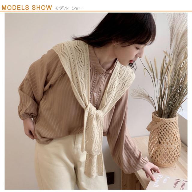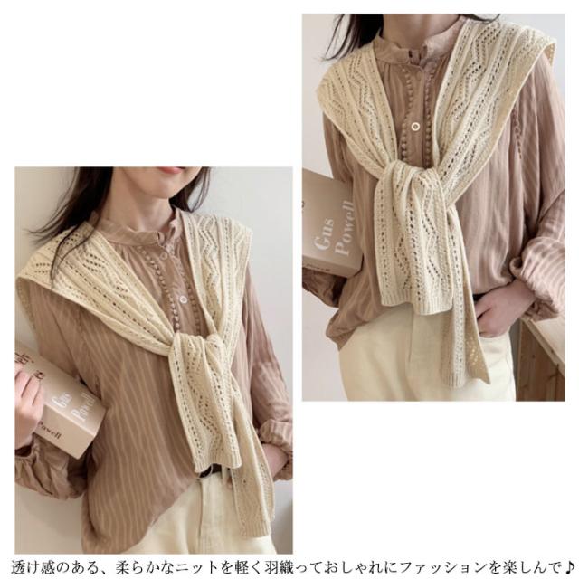 | つけるだけで華やぐ、肩掛けニット 透け感のある、柔らかなニットを軽く羽織っておしゃれにファッションを楽しんで♪ 色んな着こなしができるから、1枚持っていると重宝する。 簡単に装着可能で重ね着が苦手な方も気軽に挑戦できます。 冷房対策や季節の変わり目は洋服の調整が難しい!羽織るアイテムがお勧め。 コンパクトに畳めるのでバッグに入れて、ちょっとした防寒具としても使える。 | |