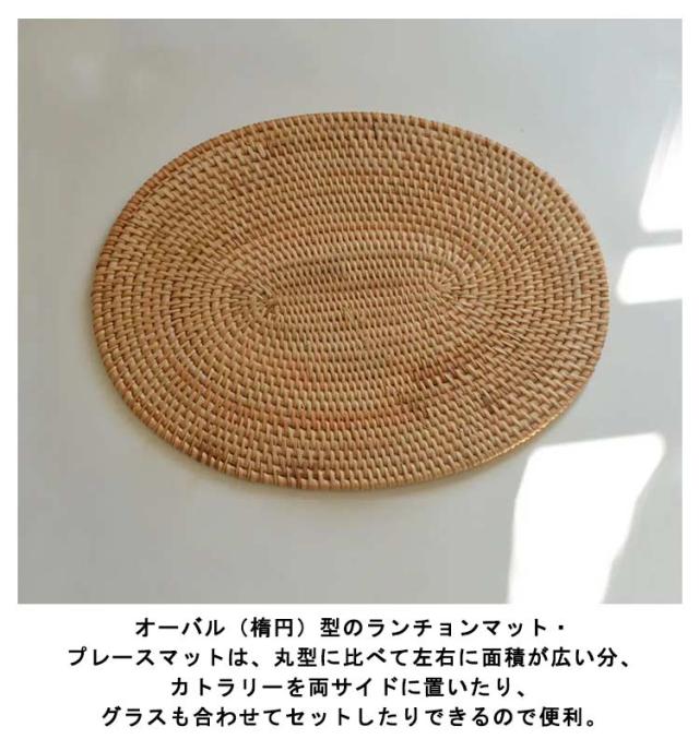 | ナチュラルテイストたっぷりのランチョンマット。 ほどよい厚みと、堅くて張りのある質感。リラックス感のあるランチョンマットに仕上げました。 ランチョンマットとしてだけでなくカップソーサーや鍋敷きとしても使えます。 アジアンテイスト溢れる南国リゾートの雰囲気を演出してくれるアイテムです。 オーバル(楕円)型のランチョンマット・プレースマットは、丸型に比べて左右に面積が広い分、カトラリーを両サイドに置いたり、グラスも合わせてセットしたりできるので便利。 シンプルなデザインで和洋折衷どんなお料理にもマッチします。 ハンドメイドで編まれているため、色合いやサイズ、形に個体差がありますが、アジアン雑貨の魅力の一つとして、お楽しみいただければ幸いです。 | |