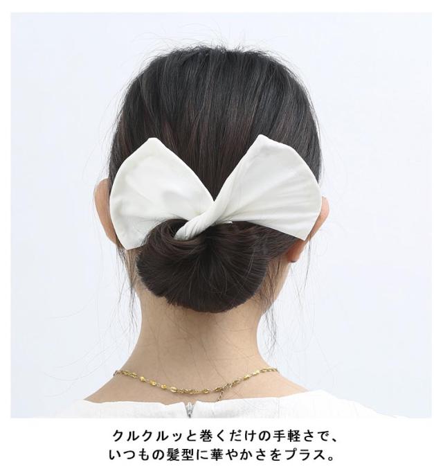 | お団子ヘアがキレイに決まる!お団子用ヘアリボン。 超簡単!挟んで巻くだけで、簡単にお団子ヘアができちゃうアイテムが作れちゃうキットです。 髪の長さに制限がなく、さまざまなヘアスタイルに適しています。 太い針金が入っていて、きつく結ぶ必要もありません。 普段使いはもちろん、旅行先でもかわいいヘアアレンジが楽しめます。 使用方法: 1.髪を毛先から切り込み部分に通します。 2.リボンを捻じって束ね、毛先が出ないように髪の先端まで持ち下げます。 3.下から髪を巻き付けながら内巻きにします。 4.両端を交差させて形を整える手完成! | |