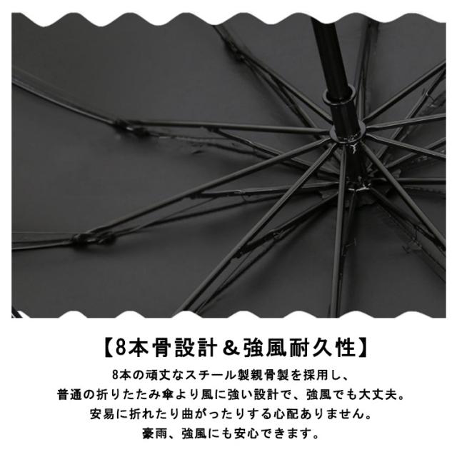 | 【超大サイズ 広範囲をカバー】 直径98cmのビッグサイズにより、成人の肩まですっぽり覆います。大人ふたりが入れて、体の大きな男性も窮屈さを感じることありません。より広い範囲をカバーできるので、雨の日は肩やカバンが濡れないようにしっかりガードしてくれて、晴れた日は紫外線や日差しから肌を守ってくれます。 【8本骨設計&強風耐久性】 8本の頑丈なスチール製親骨製を採用し、普通の折りたたみ傘より風に強い設計で、強風でも大丈夫。安易に折れたり曲がったりする心配ありません。豪雨、強風にも安心できます。 【携帯便利】 約290gの超軽量設計なので、出張、旅行の携帯用として、車の中に常備していると大変便利です。 【超撥水性&超耐久性】 超高密度の撥水加工材料で作られ、雨が玉のまま転がり落ちます。普通の折り畳み傘より撥水性が優れ、軽く振るだけで雨水を振り払えます雨に強い素材を使用することにより、強度と耐久性を実現しました。 【黒コーティング加工】 裏生地に断熱性のある素材を使用し、UVカット効果が高くなっています。なので、夏の日焼けを気にする方にピッタリ。 超撥水加工は水を弾きます。雨の日の折りたたみ時も傘に水滴が残りにくく、ズボンやスカートがびしょ濡れになる心配がありません。 | |