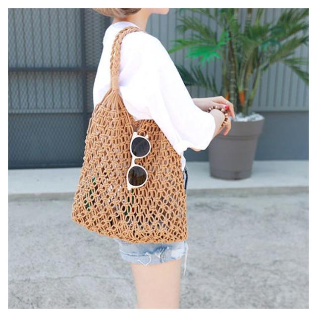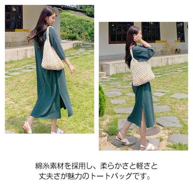 | 【シンプルなデザイン】 毎日のスタイリングに合わせやすい、カジュアルでシンプルなデザイン。 ざっくりと編んだラフな手作りの綿糸素材に、柔らかな風合いで涼しげな仕上がりです。 デイリーからレジャーシーンまで幅広く活用出来る一品に仕上がっています。 フェミニンなコーデに合わせるのもおすすめです♪ 【荷物が多くなりがちな方に最適♪】 綿糸素材を採用し、柔らかさと軽さと丈夫さが魅力のトートバッグです。 荷物が少ないときはベタンコになり、多くなったら素材の柔軟性で大容量の収容力を発揮してくれます。 ついつい荷物が多くなってしまう方にも最適です。 長財布、化粧ポーチ、手帳、スマホ、水筒、傘など収納できて、小ぶりながら大容量! 普段使いや夏のリゾートスタイルにもぴったり。 | |