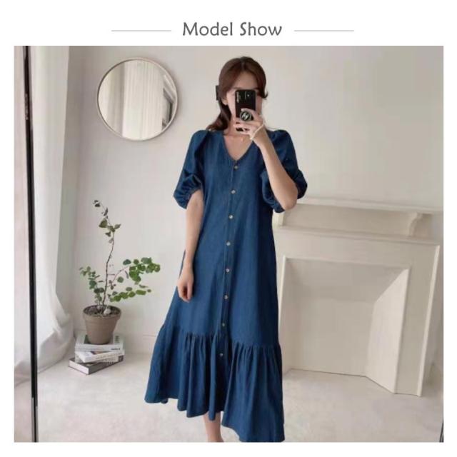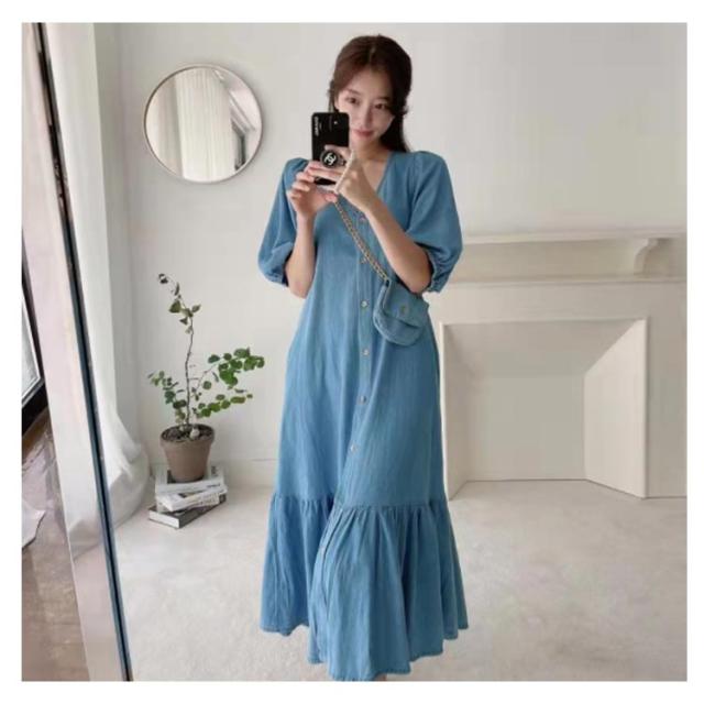 送料無料 マーメイドライン 半袖 OL ワンピース レディース Vネック パフスリーブ 大人 上品 カジュアル シャツワンピース デニム デニムワンピース 膝丈ワンピース マーメイドライン 通勤