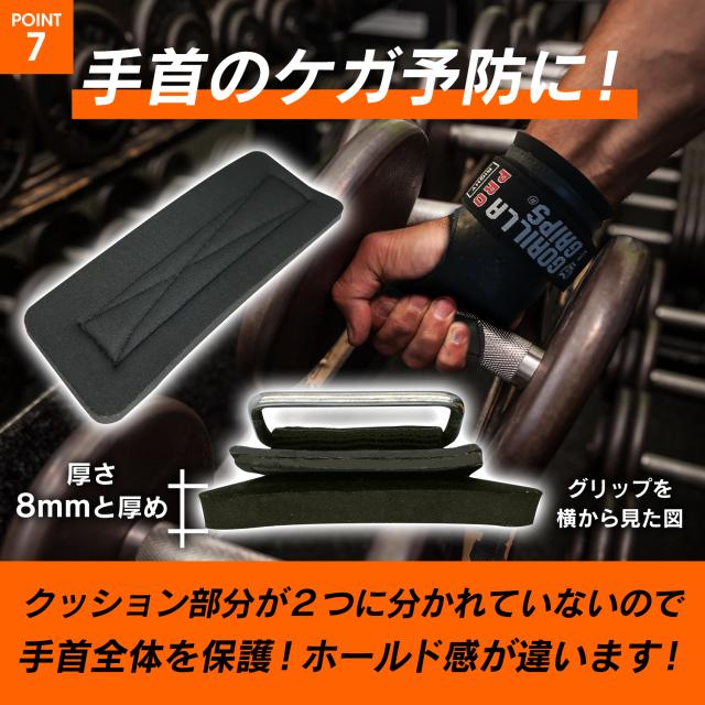 ●手首のクッション部分は厚めの8mm。一般的なグリップと違い、クションが二つに分かれていないので、手首をぐるっと包むのでしっかりとしたホールド感があり、がっちり手首を保護します。ぎゅっと締めることでリストラップのような使い方も。手首のケガの予防に。