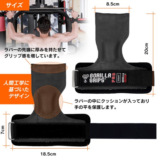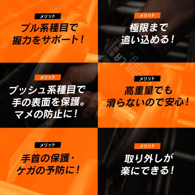 ●プル系種目(デッドリフト、 ワンハンドローイング、ベントオーバーローイング、ラットプルダウン、シュラッグなど)で握力をサポートすることで、極限まで追い込めます。 プッシュ系種目(ベンチプレス、ショルダープレスなど)では手の平にマメができたり、手の平を痛めるのを防ぐことにより、効率のいいトレーニングが可能に。