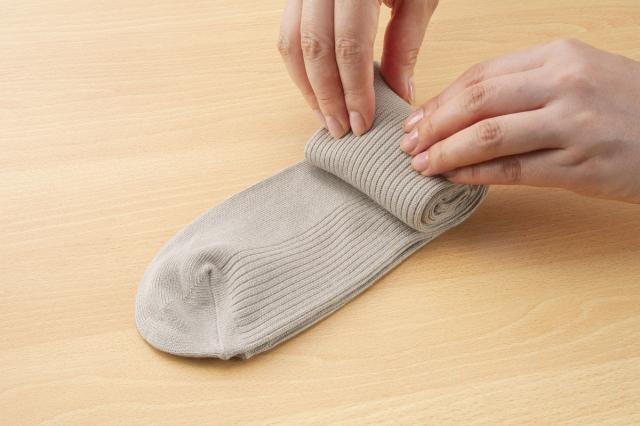 くるくるっと丸めてカップに入れるだけでキレイに収納できます。靴下の履き口のゴムが伸びるのも防げます。