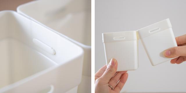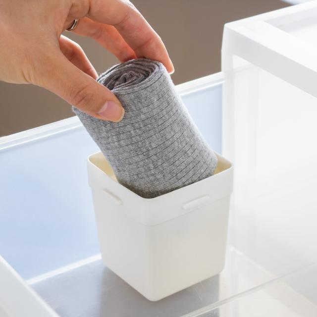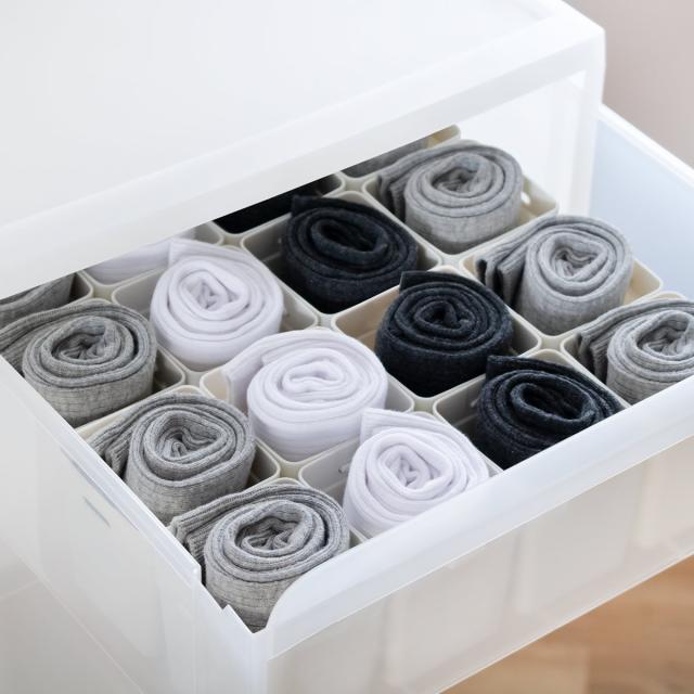 7.4cm角の整理カップで、靴下の数や引き出しのサイズに合わせてタテ・ヨコに並べて連結可能です。収納スペースを無駄なく活用できます。