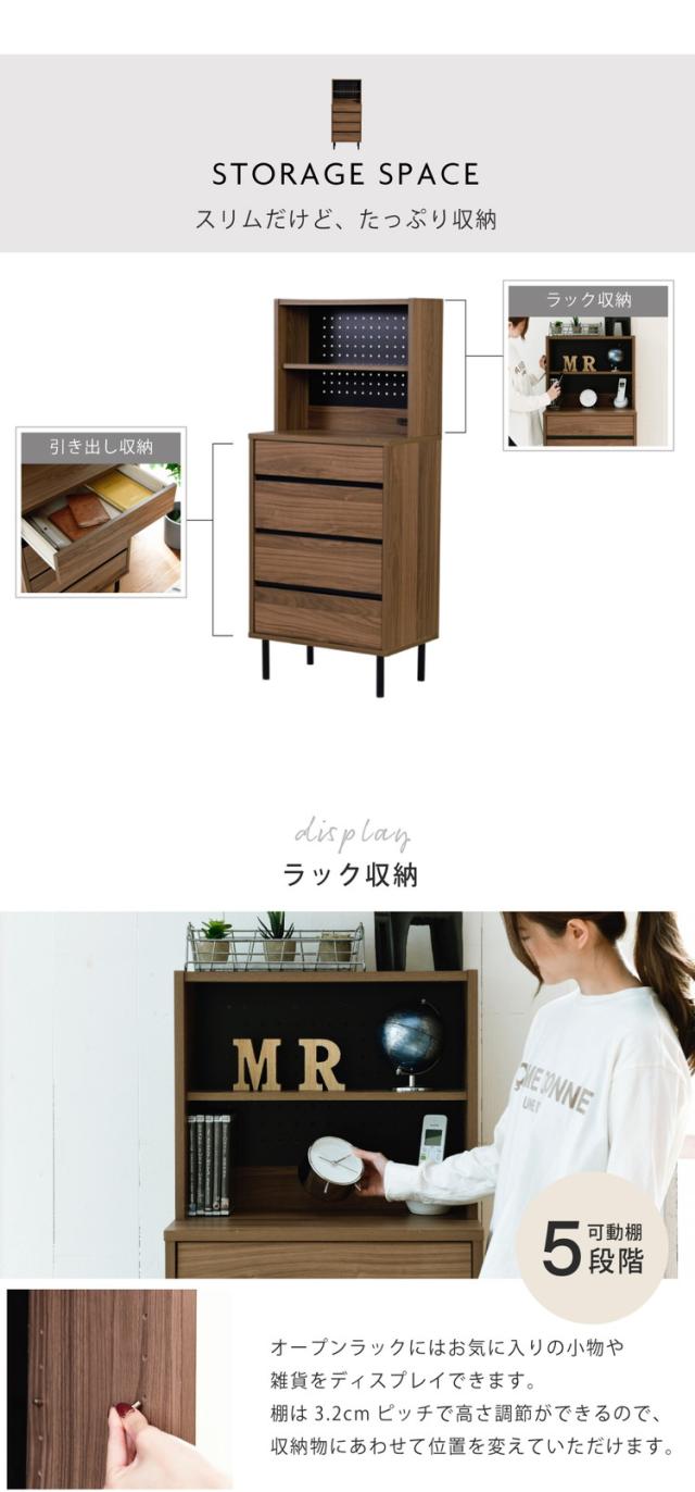 サイドボード 幅55.5 スリム 飾り棚付きチェスト コンセント付きチェスト ラック付き 木製 4段 北欧 ブラック ブラウン 引き出し 脚付き 黒 奥行35.5 薄型 収納(代引不可)【送料無料】