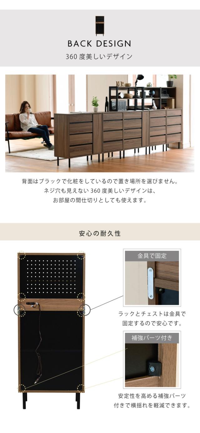 落ち着いた木目調のブラウンとブラックスチールの組み合わせがモダンな印象を与える、北欧テイストシリーズ“Fresser”。4段のチェストに有孔ボード付きのラックが付いたディスプレイチェストラック。シンプルなデザインながら、飾るもので個性を演出できます。