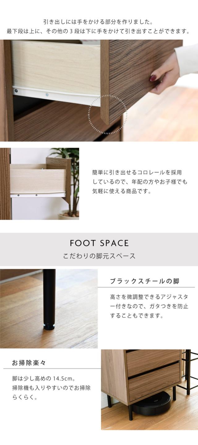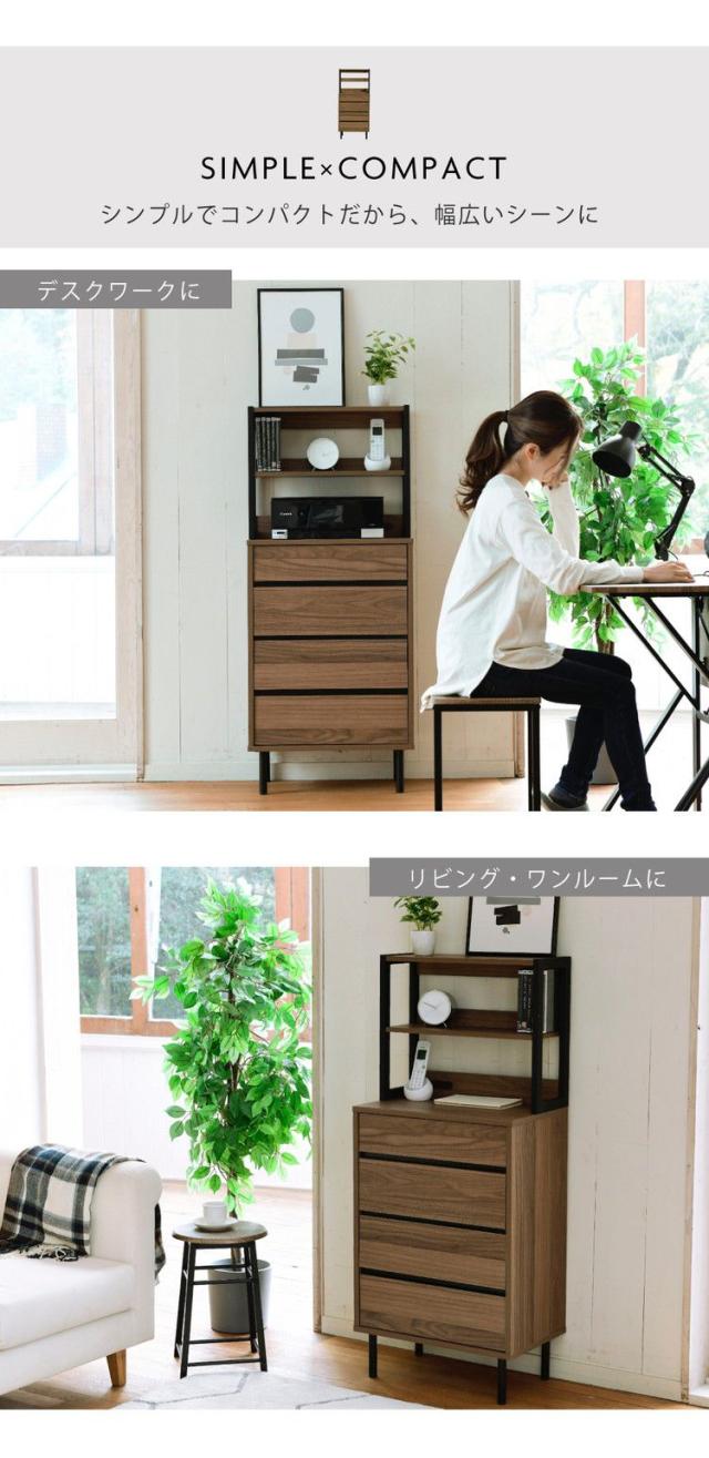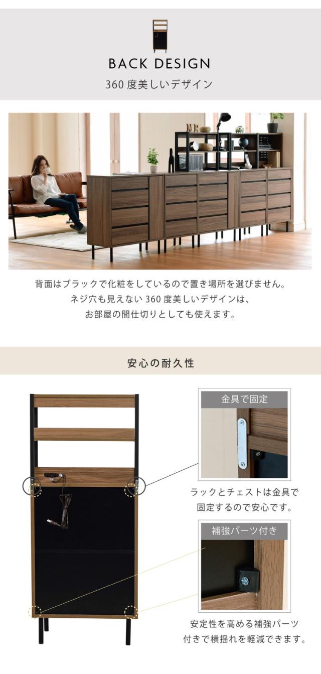 落ち着いた木目調のブラウンとブラックスチールの組み合わせがモダンな印象を与える、北欧テイストシリーズ“Fresser”。4段のチェストにオープンラックが付いたスリムチェストラック。シンプルなデザインながら、飾るもので個性を演出できます。