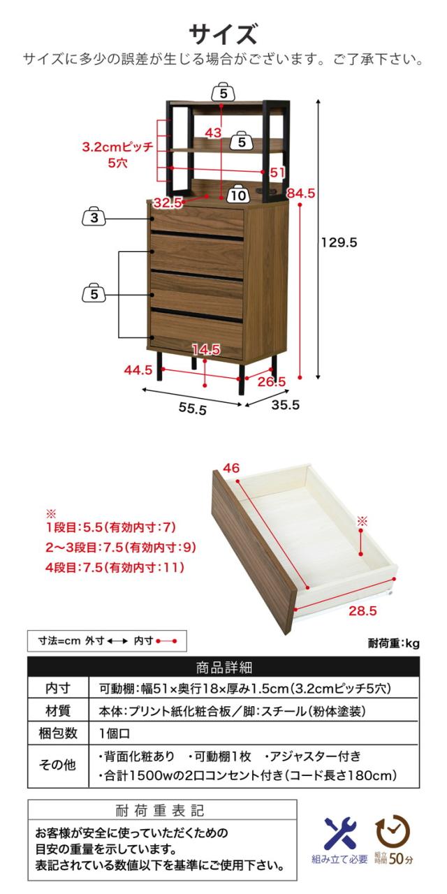 ハイチェスト 幅55.5 ラック付きチェスト スリムチェスト 4段 プリンター台 プリンターラック 木製 スリム 北欧 収納 ブラック ブラウン 脚付き サイドボード 奥行35.5cm 引き出し付き(代引不可)【送料無料】