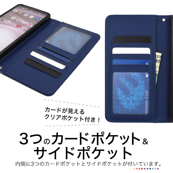 衝撃やキズなどから守ります。 また、内部はソフトケースなので着脱が簡単です。 背面を折り返すとスタンドとして使用できるので、動画視聴に便利です。 落下防止に最適なストラップとストラップホール付きです。 横開きタイプなので、手帳のように使うことができます。 また、内側に3つのカードポケットとサイドポケットが付いています。 | ||||||||||||||