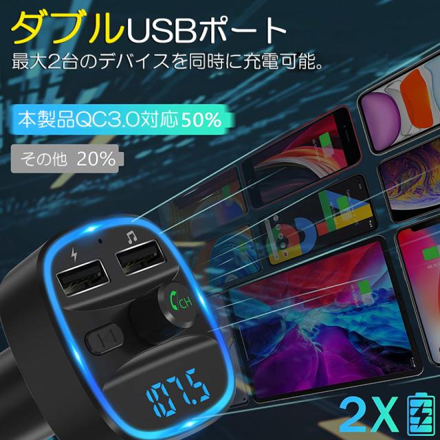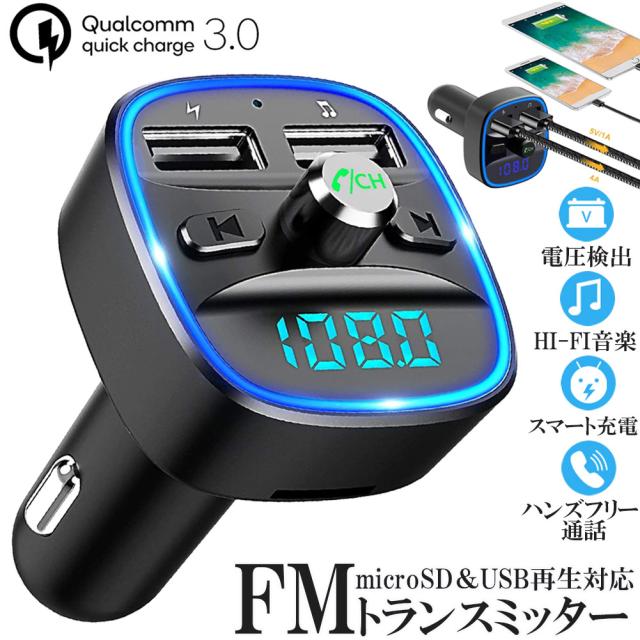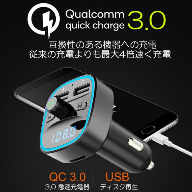FMトランスミッター bluetooth QC3.0 急速充電 対応 ハンズフリー通話 高音質 micrSD USBメモリー 再生対応 LED付 シガーソケット 車載 充電器 カーチャージャー 12V 24V 車対応 アンドロイド iPhone 各機種 ス