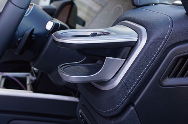 ・カップホルダー上部のパネルは、車のエアコン回りのヘアラインパネルと質感を合わせ、 ボディには塗装仕上げを施すなど インテリアとの一体感を演出します