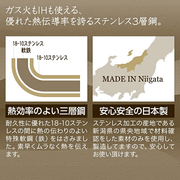 熱伝導に優れた鉄を、丈夫でサビにくいステンレスで挟んだ3層鋼の鍋。熱が素早くムラなく伝わるとともに、優れた保温力で効率よく調理できます。 |