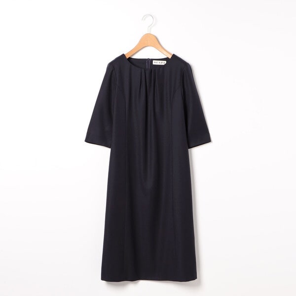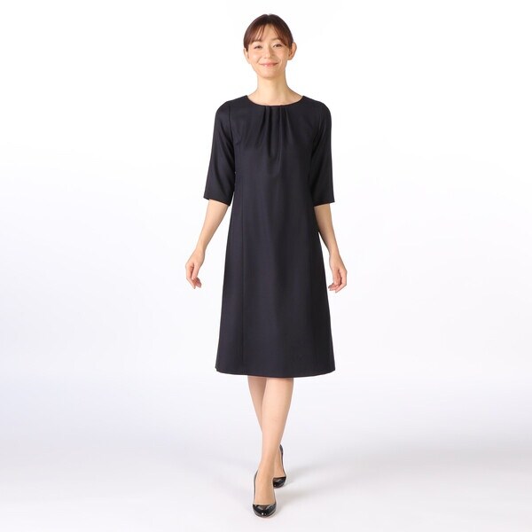 クラシカルなムードを纏った、大人のための7分袖ワンピース。身頃は自然と体に沿うようなすっきりシルエットで仕上げ、フロントネックのギャザーで立体感をプラスしています。膝が隠れる着丈で安心感があり、デイリーに取り入れやすいのも魅力です。オフの日はカーディガンを羽織り、オンスタイルではジャケットに合わせるなど、アレンジ次第で着こなしの幅が広がります。