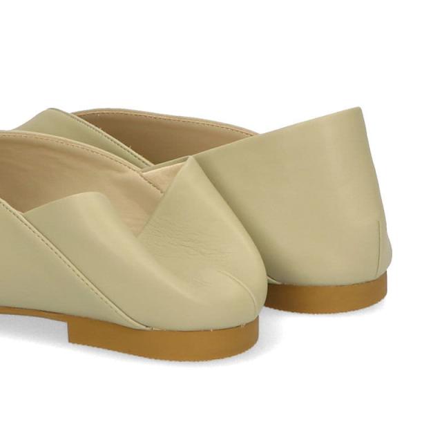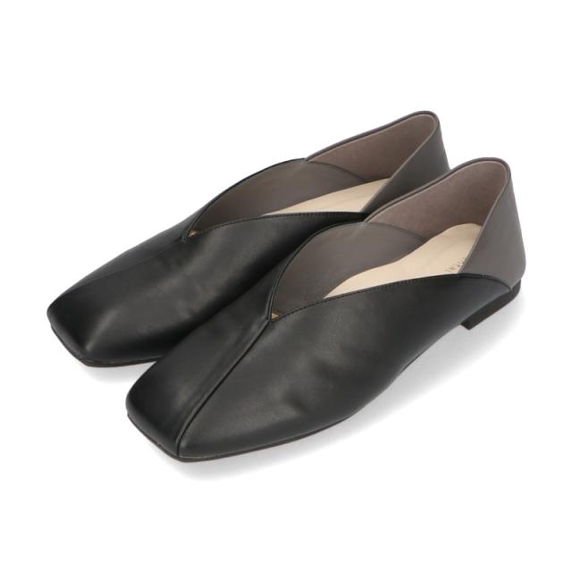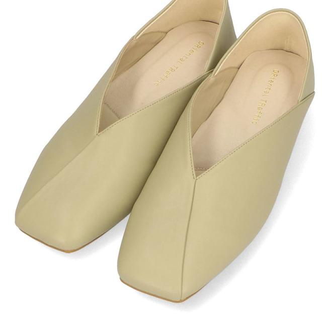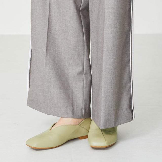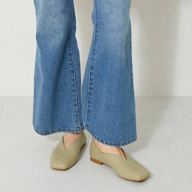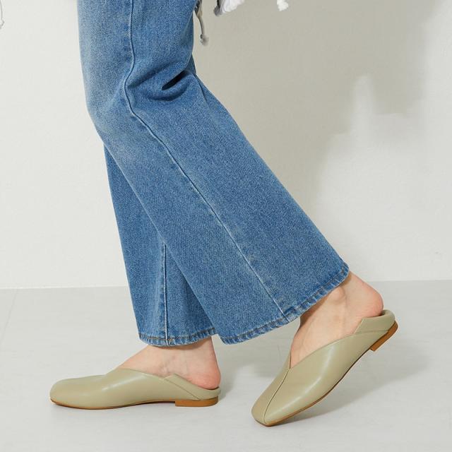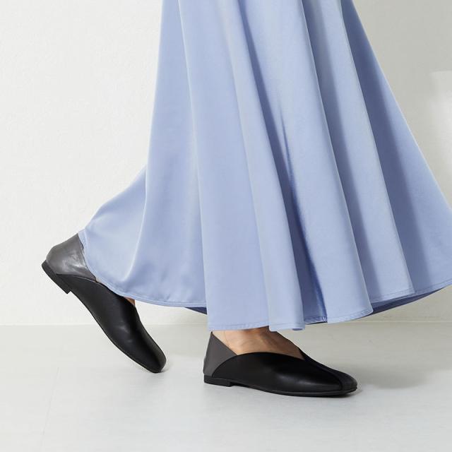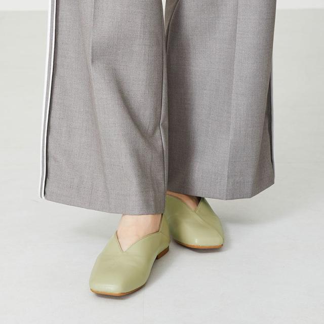 シンプルでデイリー使いやすいバブーシュは、斜めの切替とVカットの履き口で足元がすっきりと見えるデザイン。
