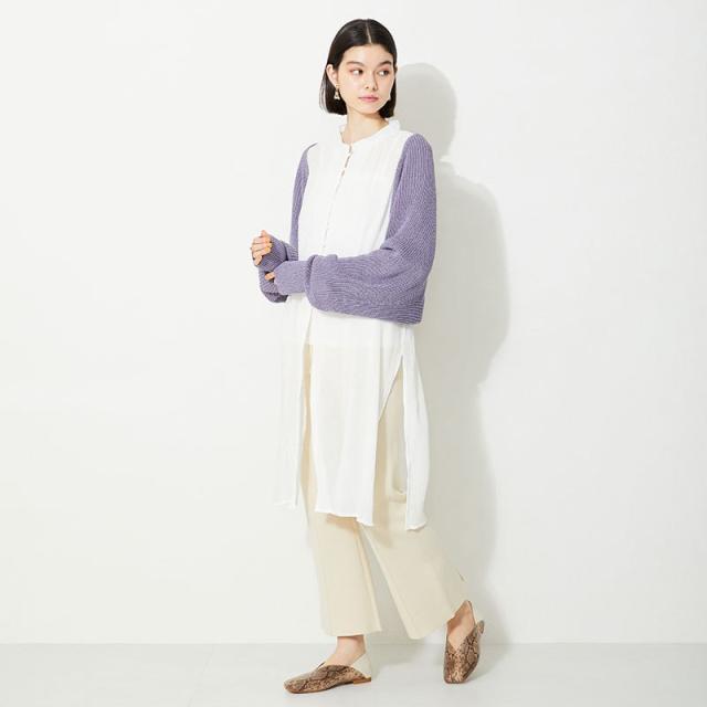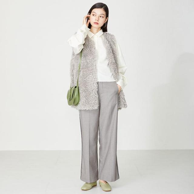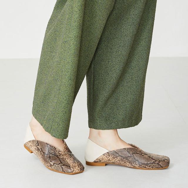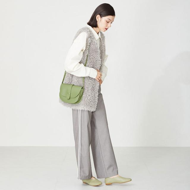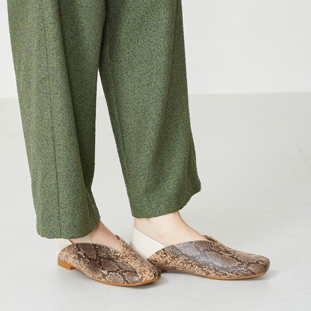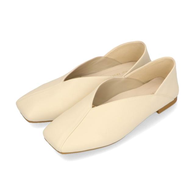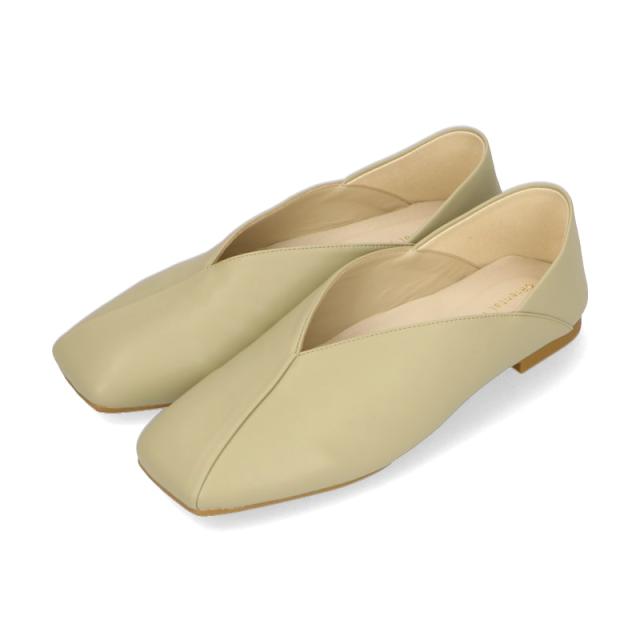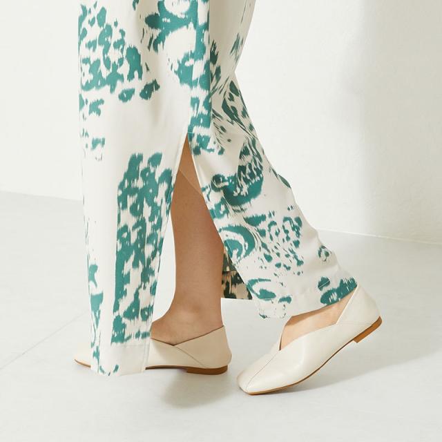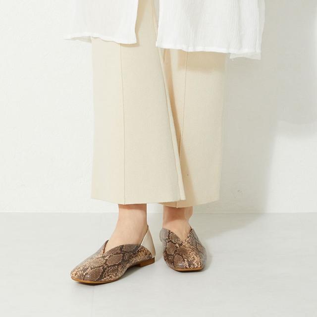 シンプルでデイリー使いやすいバブーシュは、斜めの切替とVカットの履き口で足元がすっきりと見えるデザイン。