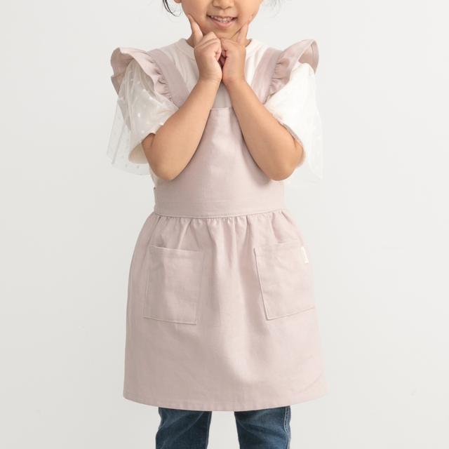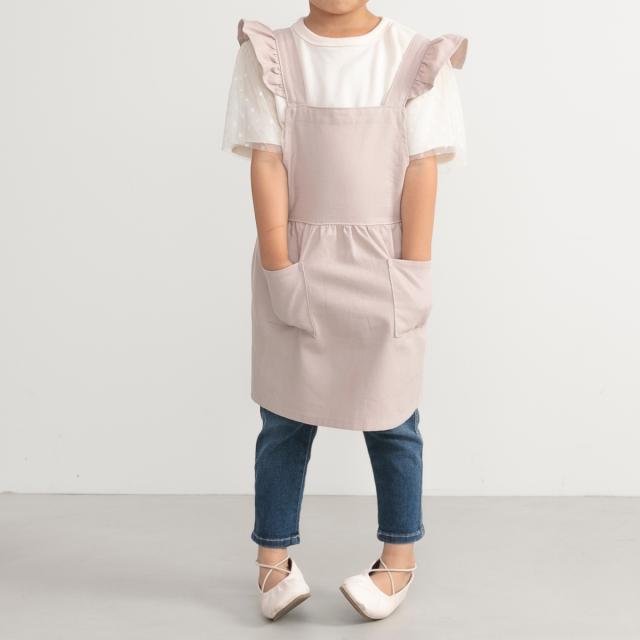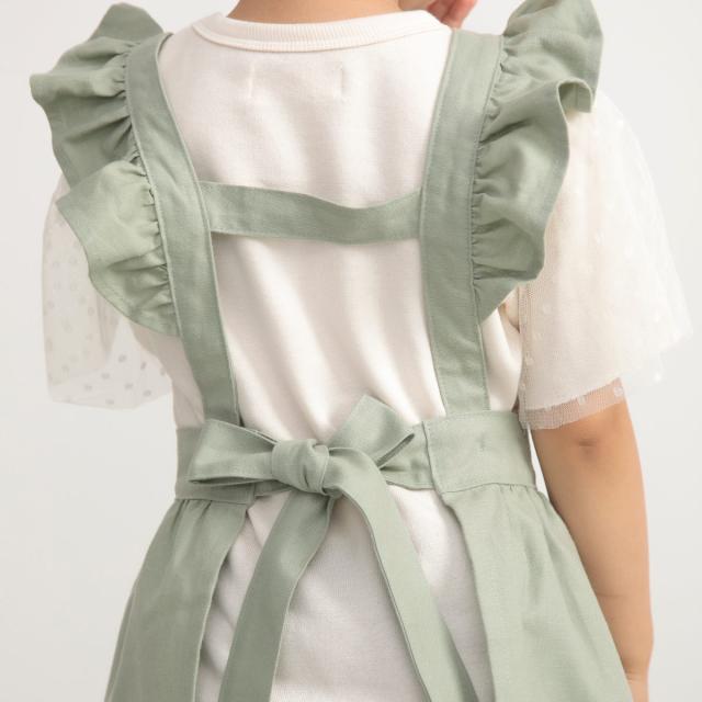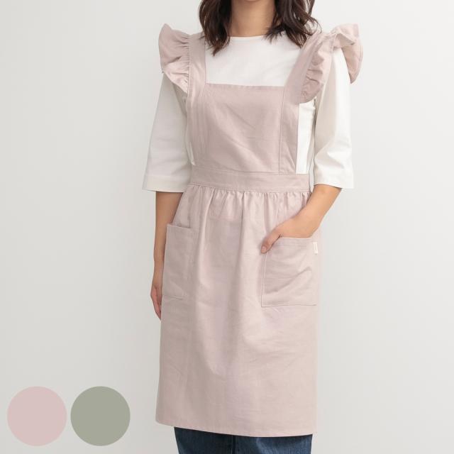 エプロンの肩にあしらったフリルとくすみカラーの組み合わせが、ガーリーで可愛らしいエプロンです。膝あたりまでの動きやすい着丈なので、洋服感覚で着ることができます。
