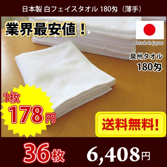 【送料無料】業界最安値! 36枚セット 日本製 泉州 白タオル 薄手 180匁 / タオル 普通のタオル 白いタオル 業務用タオル フェイス 白 ホワイト 業務用 洗車 理髪店 掃除 雑巾 まとめ買い 国産