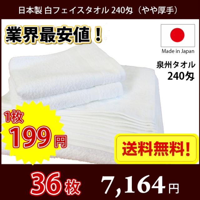 【送料無料】業界最安値! 36枚セット 日本製 泉州 白タオル やや厚手 240匁 / タオル 普通のタオル 白いタオル 業務用タオル フェイス 白 ホワイト 業務用 理髪店 掃除 雑巾 まとめ買い 国産