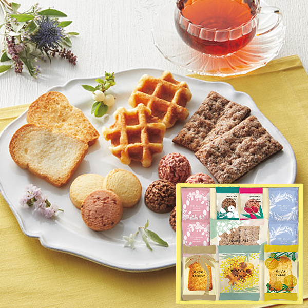 ●焼きほろろクッキー×4(プレーン・いちご各2)、スクエアパイ(ショコラ)×1、ワッフル(プレーン)×1、ラスク×2(シュガー・ココナッツ各1)、チョコレートクランチ×2(ミルク・いちご各1)