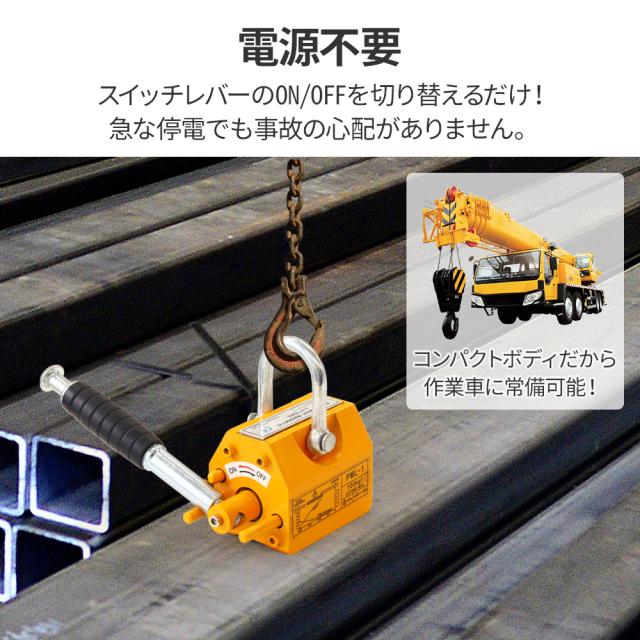 スイッチレバーのON/OFFを切り替えるだけで、簡単に重量物を持ち上げられます。電源不要だから急な停電でも事故の心配がありません。