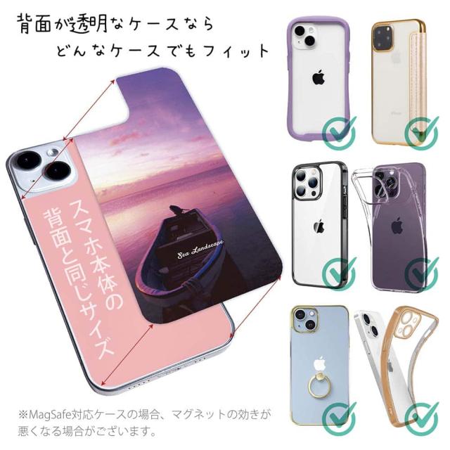 | デザインシートについて | 商品画像にあるとおり、スマホの背面の面積に合わせて象(かた)どっているので、背面が透明なケースなら、基本的にどんなケースにも対応できます。 商品画像はiPhone14をベースに撮影して掲載していますが、実際はご希望の機種毎にシートの形を切り替えて作成いたします。 コンポスケースの場合・・・当店で販売しているコンポスケースは、ケースの内側に若干カーブがあるため、通常のデザインシートを入れて使うと、左右に少し余白が空きすぎてしまいます。コンポスケース用のデザインシートをご希望の場合は、備考欄に「コンポスケース用を希望」とご記載下さい。 |