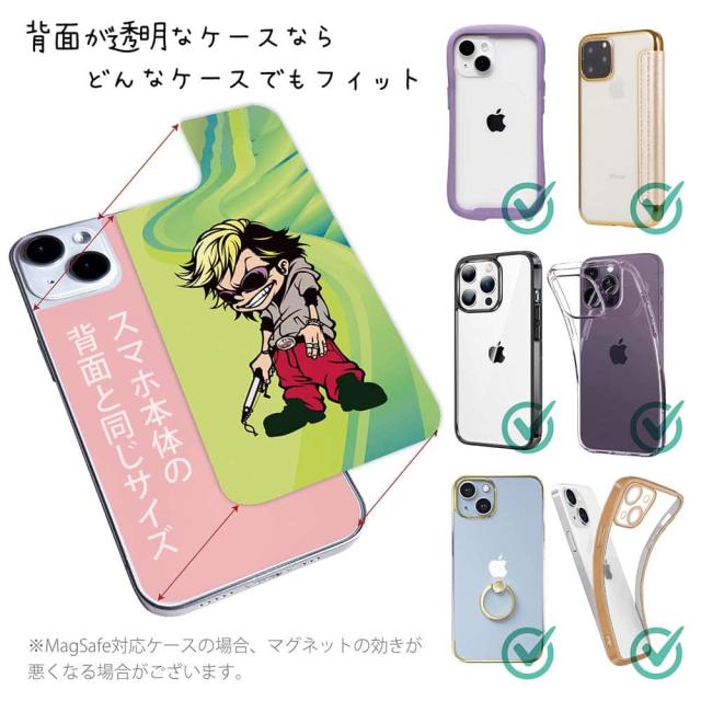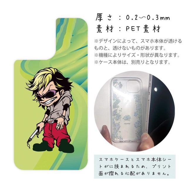 | 注意事項 | ・他の商品とは異なり、お客様都合による交換・返品・キャンセルは一切できない商品となります。ご注文の前に必ず間違いがないかを入念に確認してください。 ・また、シートの取り付け時におけるケースやスマホ本体の破損などは、弊社の責任範囲外となります。 ・UV印刷という方法でシートの印刷をしているため、表面は少しザラついているマット加工になります(商品画像より色が沈んで感じるかも知れません)。 ・背面が曲線になっている機種は対応できません(例えばXperia XZ3など)。 ・お手持ちのスマホケースの背面の状況によって、デザインシートの透け方が変わりますので、予めご了承下さい(曇りガラスのように透けにくい場合はデザインが見えにくくなります)。 ・スマホケースは付属していません(別売)。 ・商品画像の5枚目と6枚目の写真は、スマホの背面の色によるサンプル画像です。シートの背面が透明の場合は、スマホの背面が透けるという意味になりますので、背景の色を変更している訳ではありません。 |