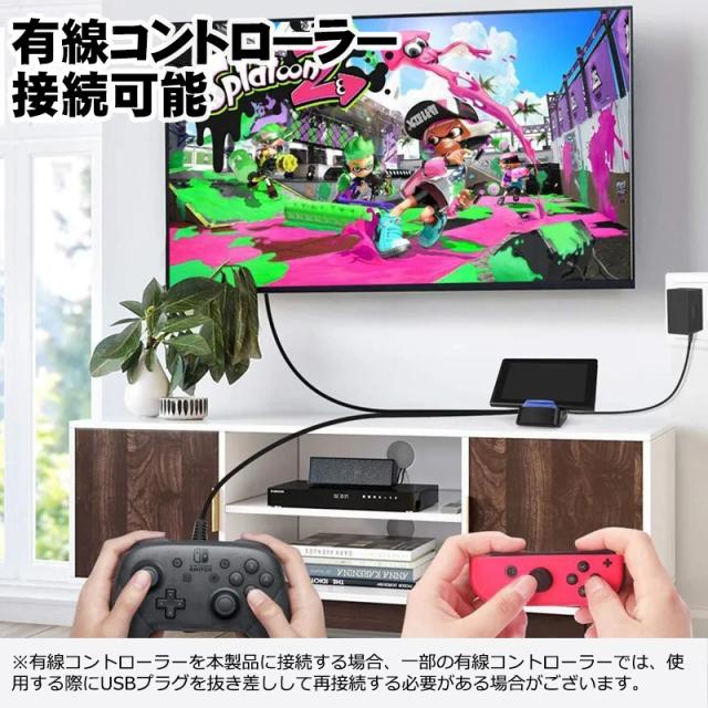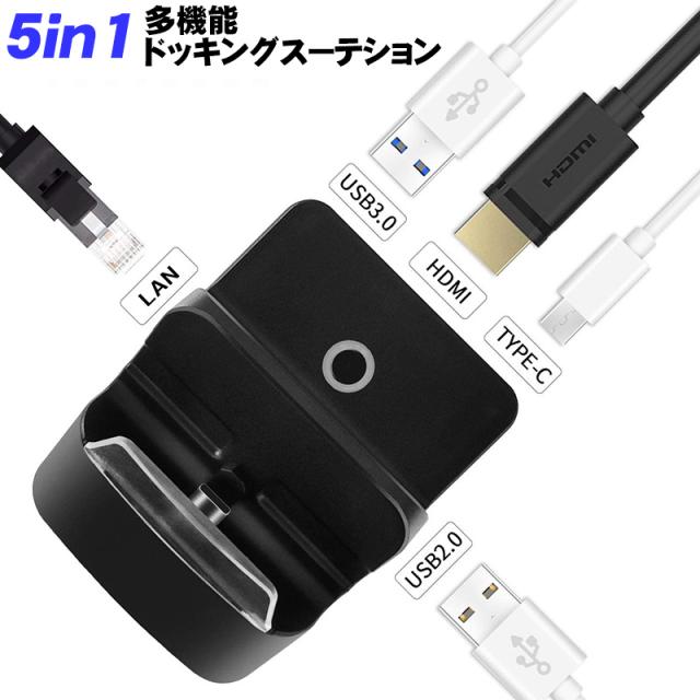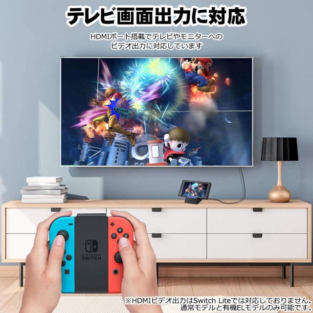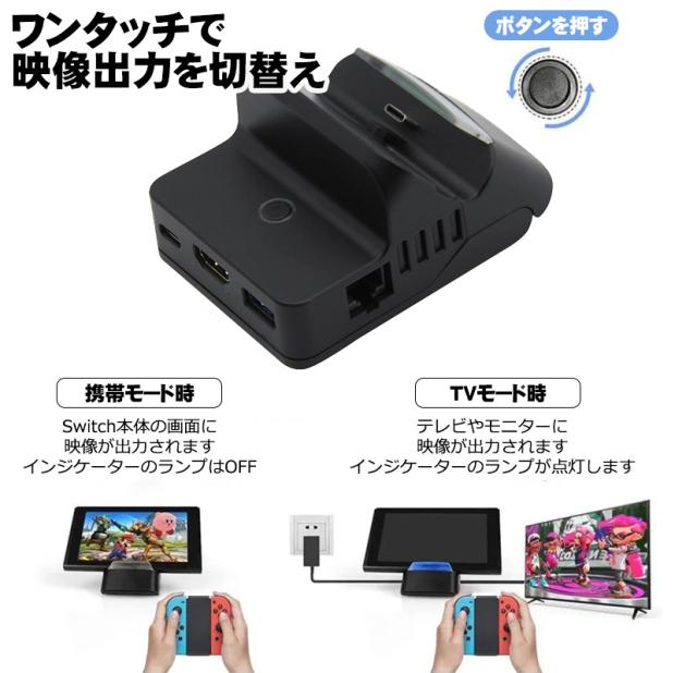| Nintendo Switch通常モデル 有機ELモデル Switch Liteに対応した5-in-1多機能ドッキングステーション( ミニドック )です。 HDMIポート 有線LANポート Type-C充電ポート USB3.0/2.0ポートの計5つのポートを搭載しています。 有線LANポート搭載で、有線インターネット接続が可能。無線より安定した有線接続でより快適なゲームプレイに。 USB3.0×1、USB2.0×1の2つのUSBポートを搭載。有線コントローラーの接続に対応します。 HDMIポート搭載でテレビやモニターへのビデオ出力に対応しています。 ドック本体のボタンを押すと、Switch本体画面への出力とテレビ画面への出力をワンタッチで切り替え出来ます。ビデオ出力時にはドックのインジケーターランプが点灯し、出力状況が一目で分かります。 スタンドとしても使える充電ドックなので、携帯モードのSwitchを充電しながらプレイ可能です。 ドックは4段階の角度調整が可能。最適な角度に調整することができ、快適にゲームを楽しめます。 底部に滑り止めパッドが二箇所付いており、滑りにくい設計でより安定した設置が可能です。 側面と底部に放熱口を搭載しているので、熱くなりにくい設計です。 純正のものよりコンパクトで軽量なので、旅行などでの持ち運びにも便利です。 |