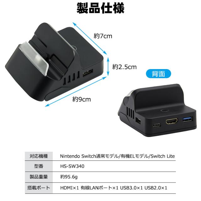 | ・型番:HS-SW340 ・対応機種:Nintendo Switch 通常モデル 有機ELモデル Switch Lite ・サイズ:約D90×W70×H25(mm) ・搭載ポート:HDMI×1 有線LAN×1 Type-C×1 USB2.0×1 USB3.0×1 ・重さ:約95.6(g) |
