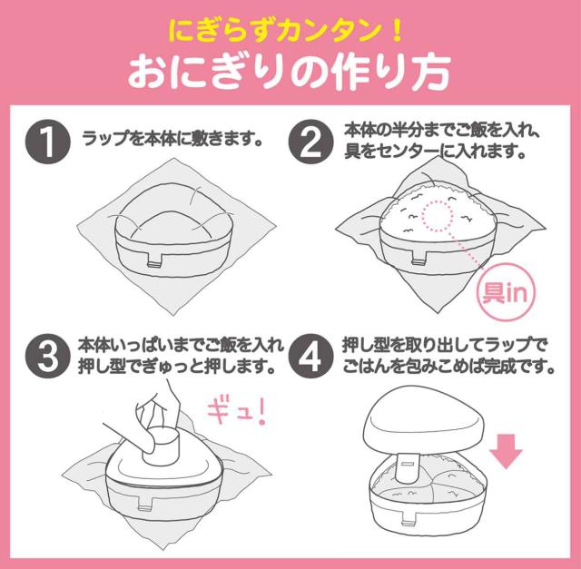 ラップを使って、手を汚すことなく簡単におにぎりが作れます。作ったらそのままおにぎりケースとして持ち運ぶことができるので、お弁当作りの時短になります。