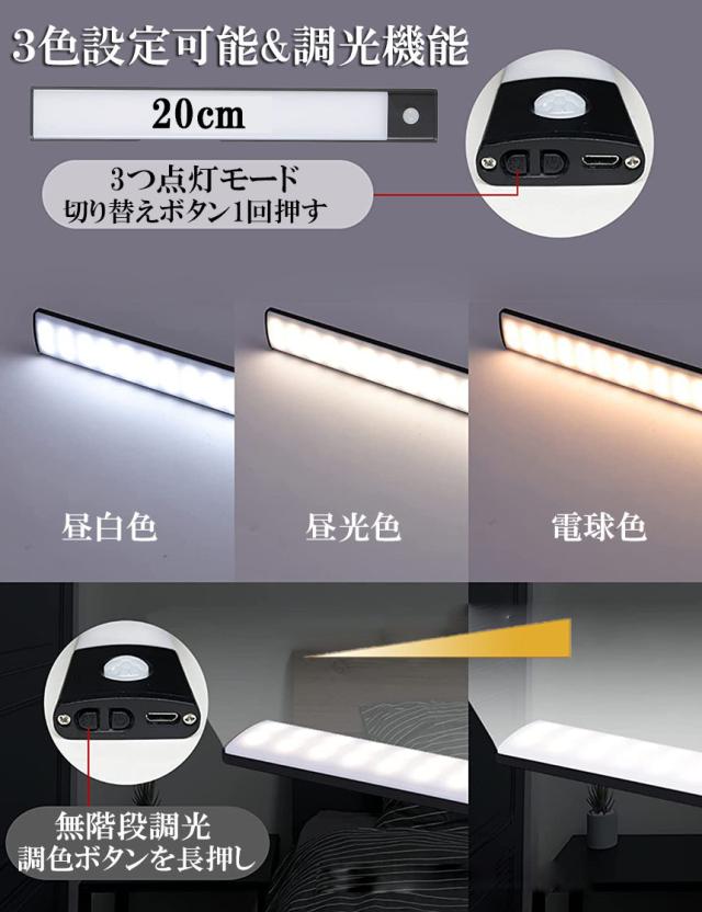 LEDセンサーライト 人感センサーライト キッチンライト フットライト LEDバーライト 色温度/明るさ調整可能 20cm 3段階調色 電球色 昼白色 昼光色 超薄型設計 非接触 USB充電式 ケーブル付き 卓上LEDライト 無段階調光 手元灯 流し元灯