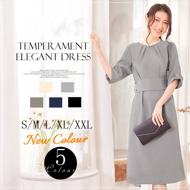 ワンピース 入学式 入園式 卒園式 黒 ドレス パーティー フォーマルドレス コクーン レディース 五分袖 ミモレ丈 ベルト付き 体型カバー リボン