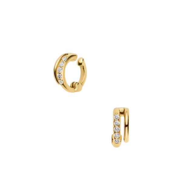 キュービックジルコニアと地金のラインが平行に並んだベーシックで華やかなイヤリング。キュービックジルコニアを贅沢に使用し、小ぶりながらも存在感のある華やかさ。耳たぶに沿ったデザインで付けやすいサイズ感がポイントです。可動部分のカシメの力で耳たぶに固定するため、圧迫感が少なく装着していただくことが出来ます。