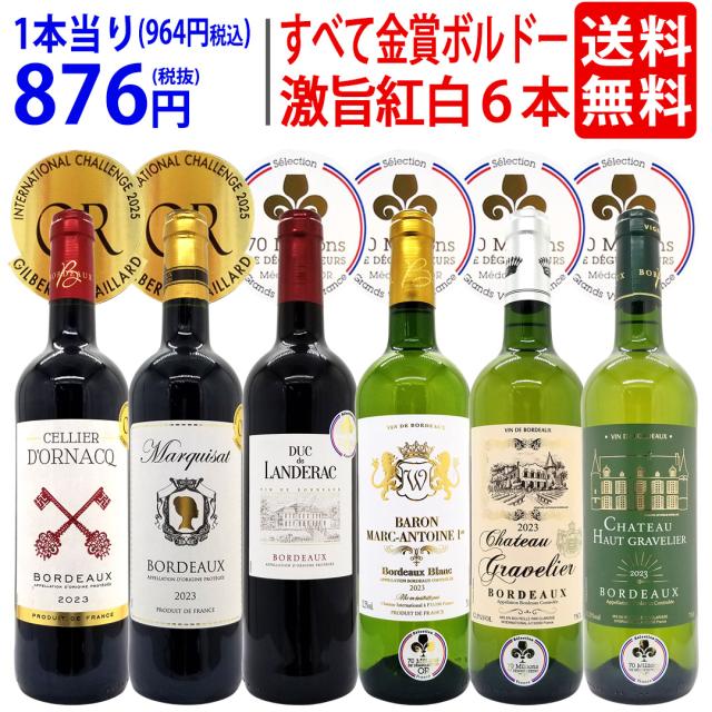 ワイン ワインセット すべて金賞フランス名産地ボルドー激旨赤白6本セット (赤3本、白3本) 送料無料 飲み比べセット ^W0UJ18SE^