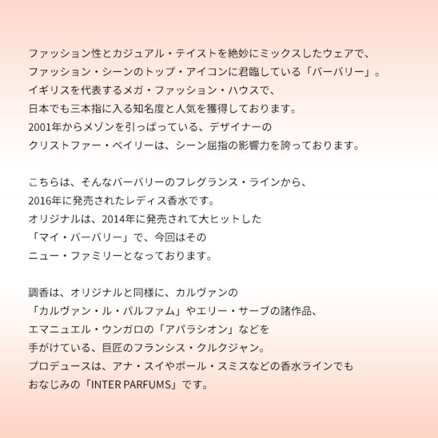 こちらは、そんなバーバリーのフレグランス・ラインから、2016年に発売されたレディス香水です。オリジナルは、2014年に発売されて大ヒットした「マイ・バーバリー」で、今回はそのニュー・ファミリーとなっております。
