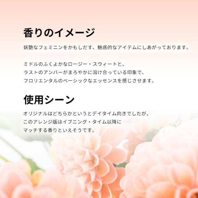 香りは、オリジナルよりもミニマルで、大人っぽい印象のフローラル・オリエンタルの香調がベース。妖艶なフェミニンをかもしだす、魅惑的なアイテムにしあがっております。