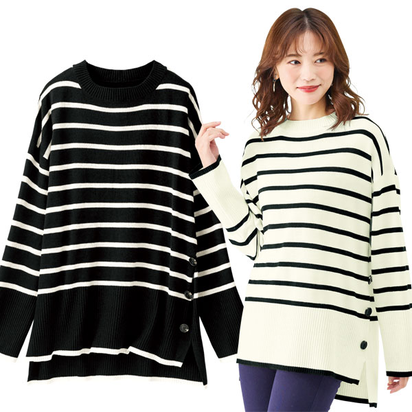 肌ざわりが良くチクチクしにくい安心の着心地。左脇のボタンと長めリブがお洒落なデザインニット。ちょうどいい厚さの素肌に優しい素材を使用。長めの後ろ身頃で体型もカバーできます。ネットに入れて洗濯機で洗えるのでお手入れも簡単!オフホワイトにブラックのボーダーが入った「オフ×黒」と、ブラックにオフホワイトのボーダーが入った「黒×オフ」の2色からお選びいただけます。