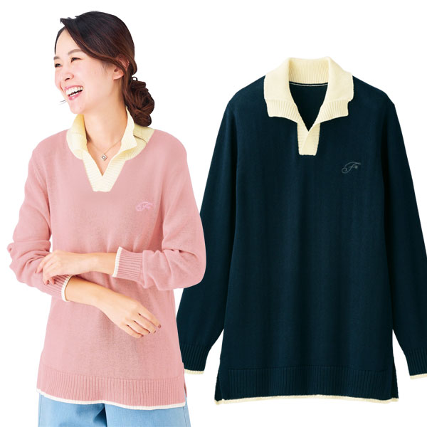 スキッパーニット配色プルオーバー 同サイズ2色組 スキッパー衿 両脇スリット入 綿100% 春秋 レディース 婦人服 961550