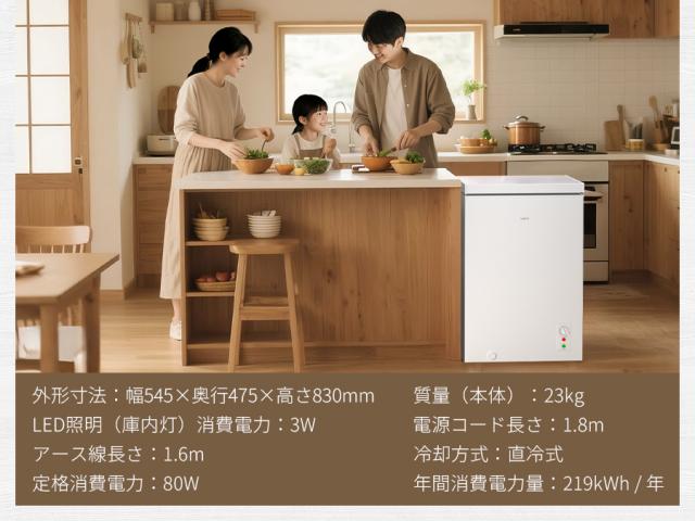 「毎日使うものだから、電気代も気になる…」→上開き式で解決! 冷気が下にたまるので、扉の開閉時でも庫内の温度変化が少なく、食材の鮮度をしっかりキープできます。 さらに、前開き式のような棚の仕切りがないため、大きな食材やまとめ買いのストックも自由に収納でき、無駄なく空間を活用できます。 冷気が逃げにくいことでコンプレッサーの稼働も抑えられ、省エネ性能もしっかり発揮します。