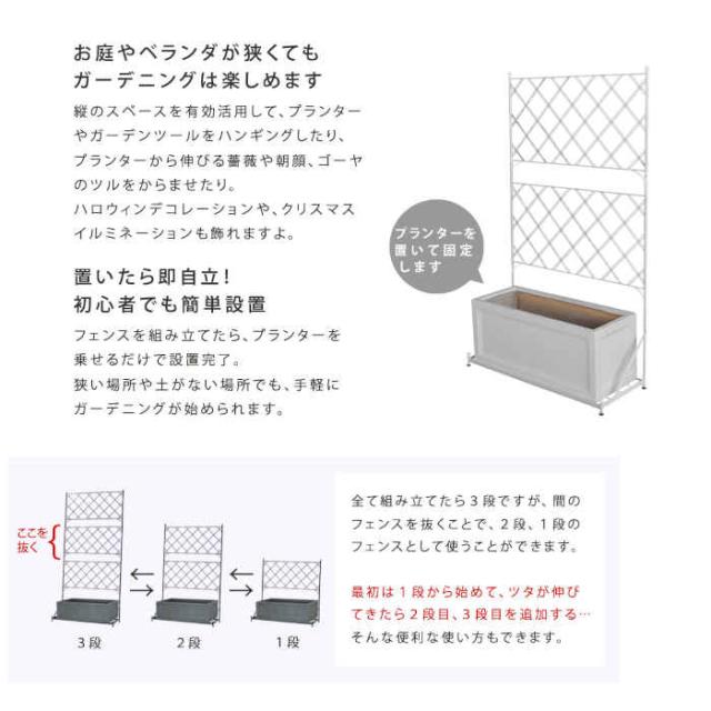 プランター台付フェンスのロータイプ。カラーは、ブラック(4515085031642/IF-FP006BLK)、ホワイト(4515085031659/IF-FP006WHT)です。お庭やベランダが狭くてもガーデニングは楽しめます。縦のスペースを有効活用して、プランターやガーデンツールをハンギングしたり、プランターから伸びる薔薇や朝顔、ゴーヤのツルをからませたり。ハロウィンデコレーションや、クリスマスイルミネーションも飾れますよ。置いたら即自立。初心者でも簡単設置。フェンスを組み立てたら、プランターを乗せるだけで設置完了。狭い場所や土がない場所でも、手軽にガーデニングが始められます。