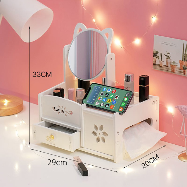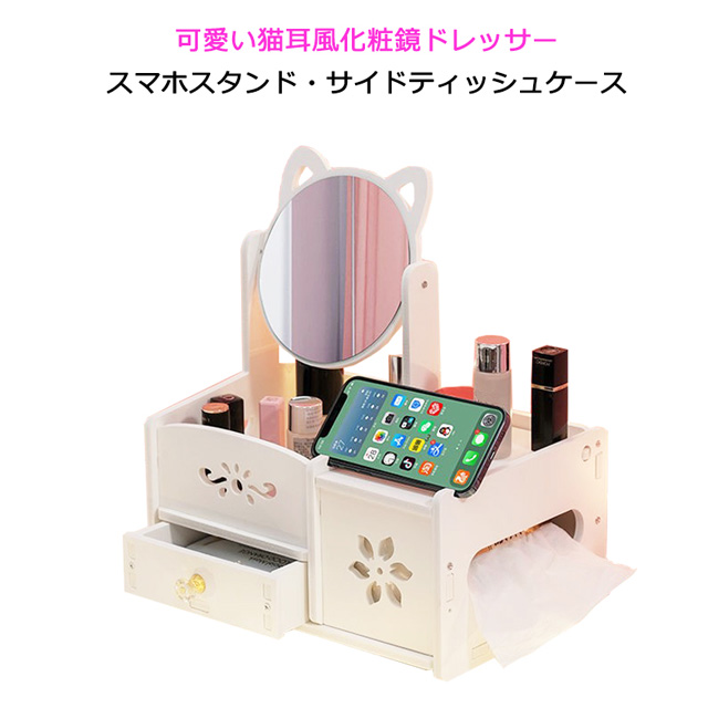 ドレッサー 鏡台 ティッシュケース 鏡 ミラー 化粧台 簡単組み立て ドレッサー 白 メイク台 卓上 収納 化粧 メイクアップ かわいい ねこ ホワイト 組み立て 引き出し付き 収納ボックス 女の子 姫系 360°角度調整 おしゃれ