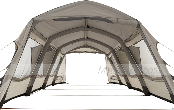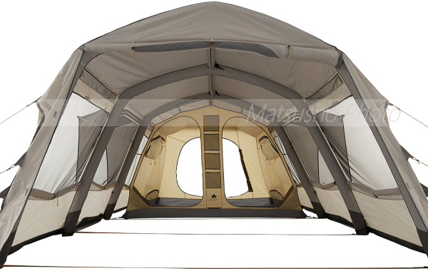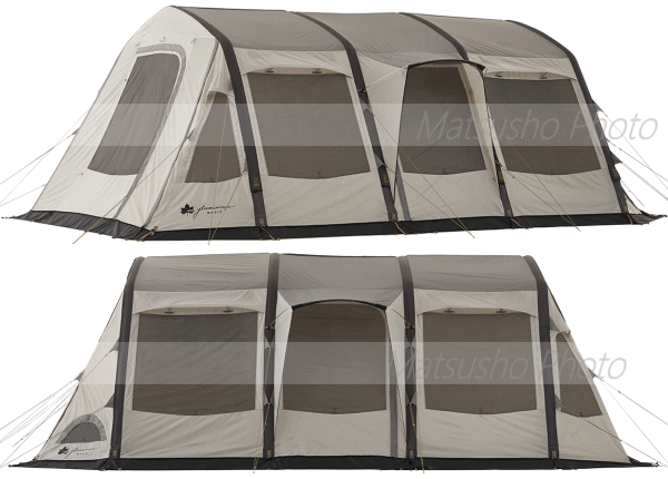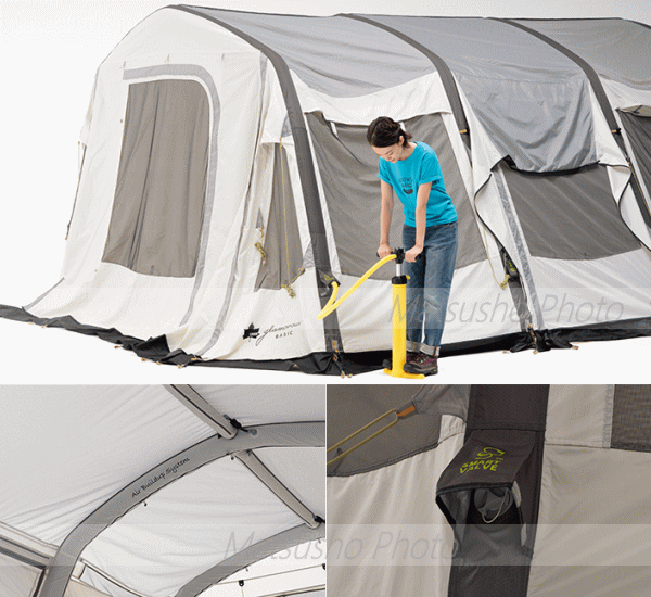 グランベーシック エアマジックリビングハウス WXL-AIはフレームの替わりに空気を注入して立ち上げるエアチューブを採用したエアーテント。専用ポンプで空気を注入するだけで約8分という短時間で設営が可能です。もちろん強度も充分。横4本のチューブに対し縦に1本梁型のチューブを通す事で横揺れにもしっかり対応。■総重量約28.0kg■組立時間約8分■サイズ約全長630×奥行380×高さ215cm(正面入口高さ200cm)■インナーサイズ約幅320×奥行210×高さ195cm■収納サイズ約縦40×横85×高さ40cm■耐水圧[フライシート]3000mm[フロアシート]3000mm■構成:フライシート(エアチューブ内蔵)、インナーテント、フレーム、キャノピーポール、エアポンプ、ロープ、収納バッグ、フレーム用収納袋、ペグ、ハンマー、小物袋※組立時間は付属の手動ポンプを使用しての空気注入の目安となります。30度を超える真夏日はエアチューブへ空気を入れ過ぎると高熱により内部が膨張して破裂する恐れがございます。空気の入れ過ぎにご注意下さい。