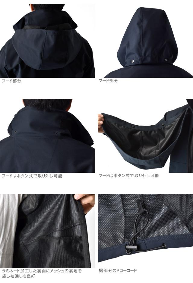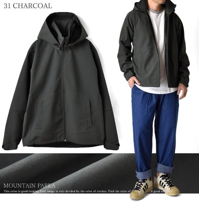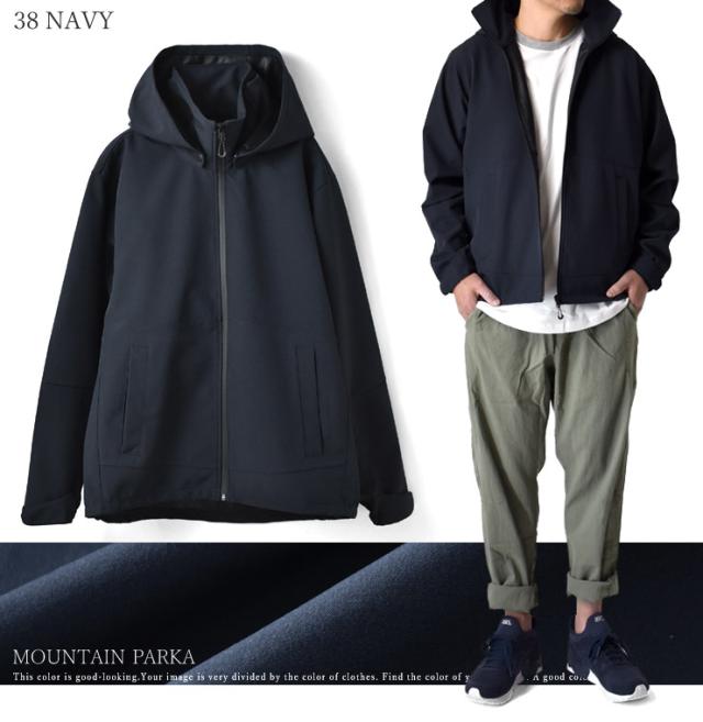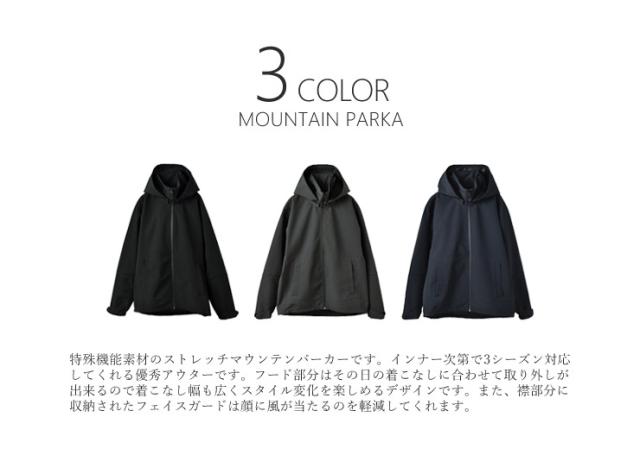 特殊機能素材のストレッチマウンテンパーカーです。インナー次第で3シーズン対応してくれる優秀アウターです。フード部分はその日の着こなしに合わせて取り外しが出来るので着こなし幅も広くスタイル変化を楽しめるデザインです。また、襟部分に収納されたフェイスガードは顔に風が当たるのを軽減してくれます。