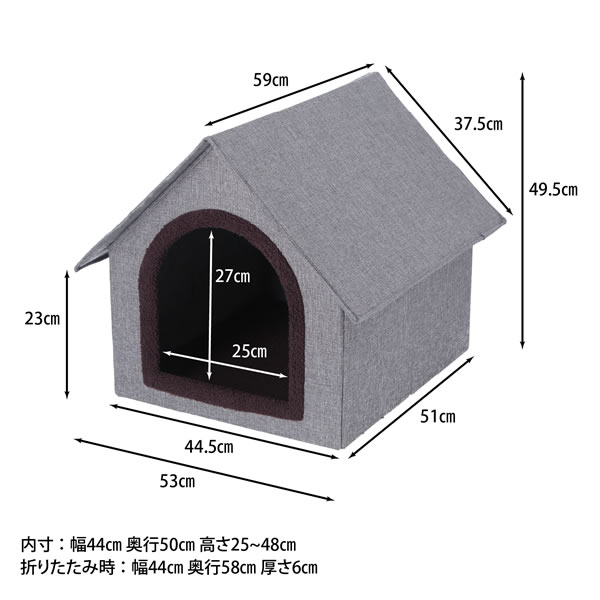 大きなペットもゆったり使える三角屋根のペットハウス 広すぎない入口で中の温められた空気をキープ。またロータイプなので、負担なく出入りができます。 屋根はマジックテープ式で簡単に開けることができます。中の様子を確認したり、お掃除の時もラクラクです。 使わない時は折りたたんで、厚さ5cmまでコンパクトに! ■カラー グレー ■商品サイズ(mm) 全体:幅530 × 奥行590 × 高さ495 開口部:W250xH270mm ■商品重量(kg) 3.3 ■素材 MDF/ポリエステル/ウレタン ※記載は商品仕様の一部です。仕様説明不足等の理由での返品はできません。特に適合等は必ずご確認ください。