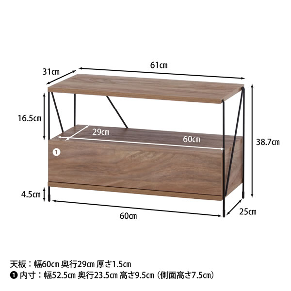 | 商品サイズ(mm) | 全体:幅610 × 奥行310 × 高さ387 耐荷重(棚板1枚):10kg 棚板厚:15mm 引出内寸:520x235x95mm |