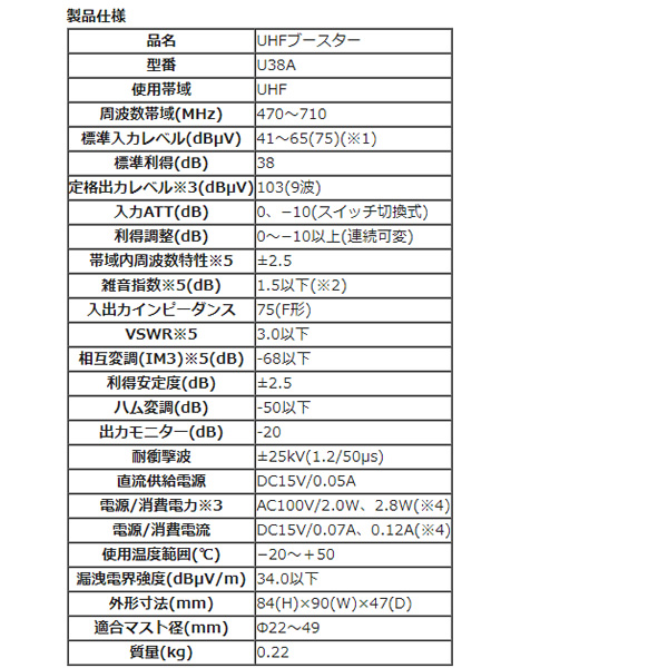 UHFを増幅するブースターです。 テレビ信号が弱い場合や、複数のテレビにテレビ信号を送る必要がある場合に電波を強くするために使用します。 小型なので水平マストにも取り付け可能。 増幅帯域:UHF38dB 屋外用。 ■品名:UHFブースター ■型番:U38A ■使用帯域:UHF ■周波数帯域(MHz):470〜710 ■標準利得(dB):38 ■定格出力レベル(dBμV):103(9波) ■直流供給電源:DC15V/0.05A ■使用温度範囲:-20〜+50℃ ■外形寸法:84(H)×90(W)×47(D)mm ■適合マスト径(mm):Φ22〜49 ■質量(kg):0.22 ※ご利用環境によっては、期待されるような結果が得られない場合がございます。 また、商品説明は概要であり、すべての商品特徴、使用条件等を表示しているものではございません。
