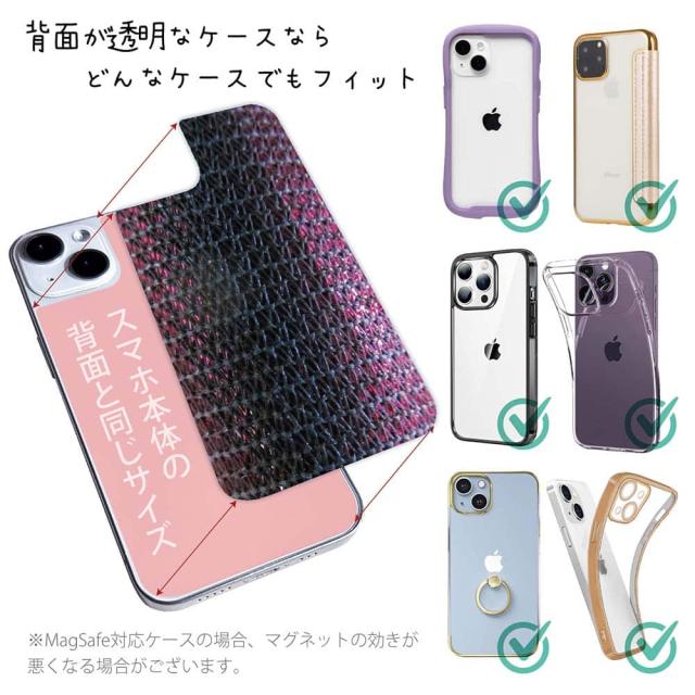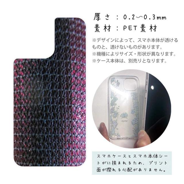 | 注意事項 | ・他の商品とは異なり、お客様都合による交換・返品・キャンセルは一切できない商品となります。ご注文の前に必ず間違いがないかを入念に確認してください。 ・また、シートの取り付け時におけるケースやスマホ本体の破損などは、弊社の責任範囲外となります。 ・UV印刷という方法でシートの印刷をしているため、表面は少しザラついているマット加工になります(商品画像より色が沈んで感じるかも知れません)。 ・背面が曲線になっている機種は対応できません(例えばXperia XZ3など)。 ・お手持ちのスマホケースの背面の状況によって、デザインシートの透け方が変わりますので、予めご了承下さい(曇りガラスのように透けにくい場合はデザインが見えにくくなります)。 ・スマホケースは付属していません(別売)。 ・商品画像の5枚目と6枚目の写真は、スマホの背面の色によるサンプル画像です。シートの背面が透明の場合は、スマホの背面が透けるという意味になりますので、背景の色を変更している訳ではありません。 |