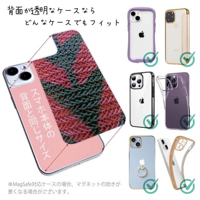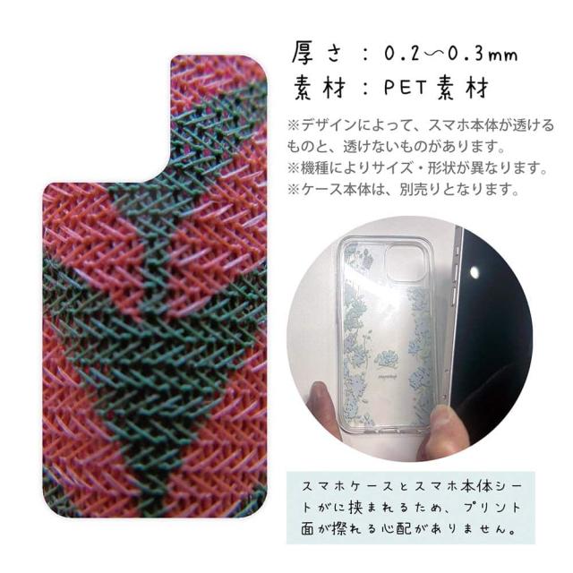 | 注意事項 | ・他の商品とは異なり、お客様都合による交換・返品・キャンセルは一切できない商品となります。ご注文の前に必ず間違いがないかを入念に確認してください。 ・また、シートの取り付け時におけるケースやスマホ本体の破損などは、弊社の責任範囲外となります。 ・UV印刷という方法でシートの印刷をしているため、表面は少しザラついているマット加工になります(商品画像より色が沈んで感じるかも知れません)。 ・背面が曲線になっている機種は対応できません(例えばXperia XZ3など)。 ・お手持ちのスマホケースの背面の状況によって、デザインシートの透け方が変わりますので、予めご了承下さい(曇りガラスのように透けにくい場合はデザインが見えにくくなります)。 ・スマホケースは付属していません(別売)。 ・商品画像の5枚目と6枚目の写真は、スマホの背面の色によるサンプル画像です。シートの背面が透明の場合は、スマホの背面が透けるという意味になりますので、背景の色を変更している訳ではありません。 |